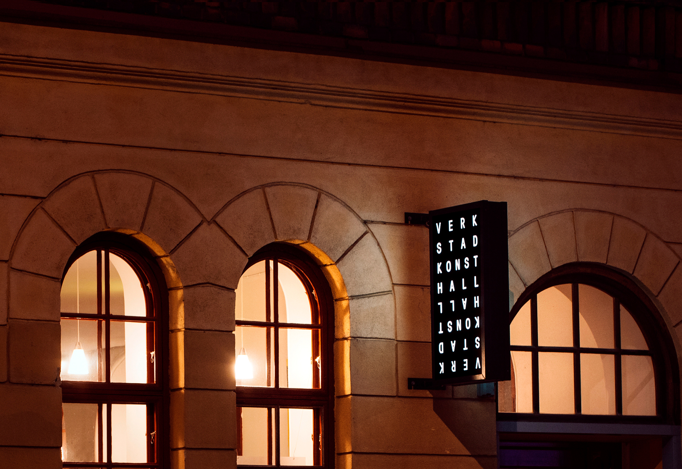 ↳ Verkstad konsthall – Signage. Fasadskyltning för utställningsyta i Norrköping.